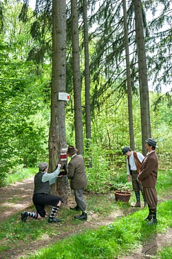 trasa KČT, která byla v roce 2014 opatřena dobovými značkami, replikami tabulek místního značení a třemi informačními panely. První trasu opustíme až v místě navážky související se